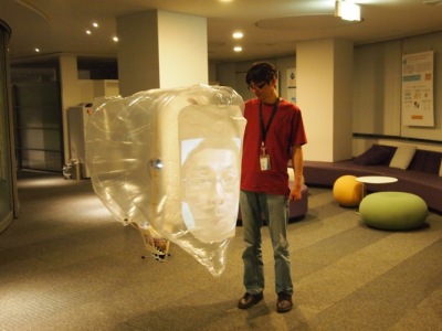 The user's presence is more dramatic than a conventional virtual avatar (CG and image) because the avatar is a physical object and moves freely in the real world. In addition, the user's senses are augmented because the blimp detects dynamic information in the real world. For example, the camera provides a special floating view to the user, and the microphone collects a wide variety of sounds such as conversations and environmental noise.